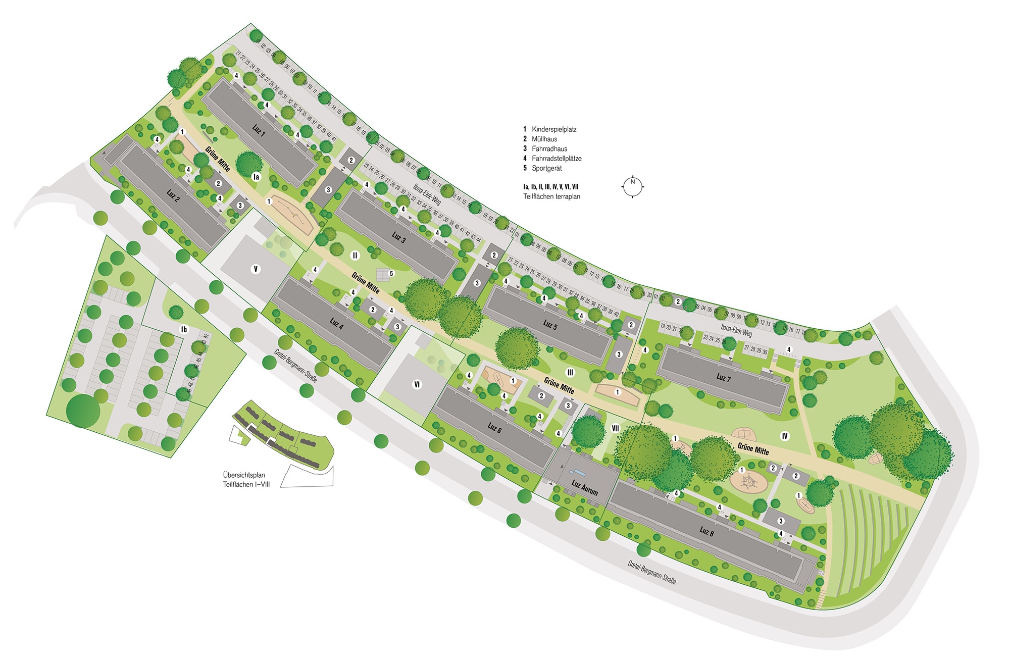 Gartenplan Luz-Long-Anlage mit Luz 1 & Luz 2, Luz 3 & Luz 4, Luz 5 & Luz 6, Luz 7 & Luz 8 und Luz Aurum